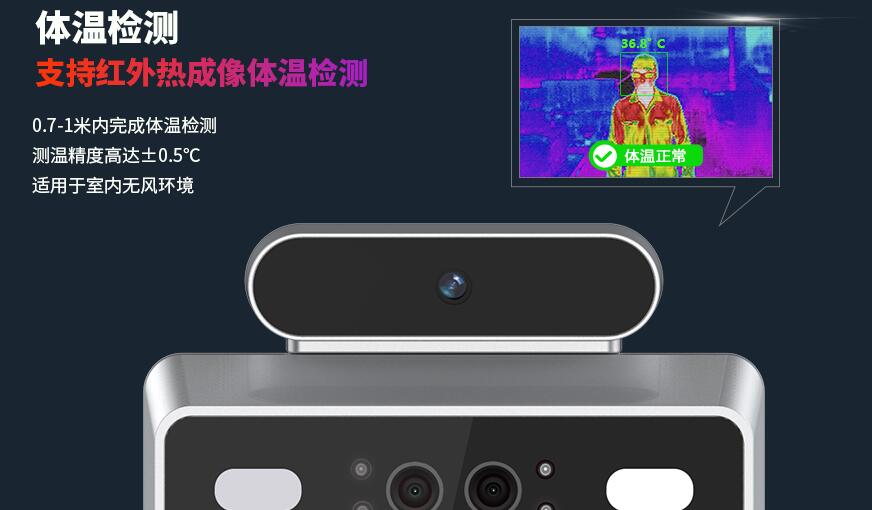 l  溫度檢測:采用(yòng)紅(hóng)外(wài)熱(rè)成像技(jì)術(shù)進行(xíng)溫度檢測;0.5米內(nèi)完成體(tǐ)溫檢測,測溫精度高(gāo)達±0.5℃